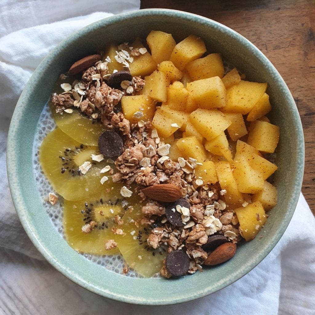 Rien de plus réconfortant que ce porridge aux graines de chia, pomme cuite à la cannelle, kiwi, granola et pépites de chocolat noir.